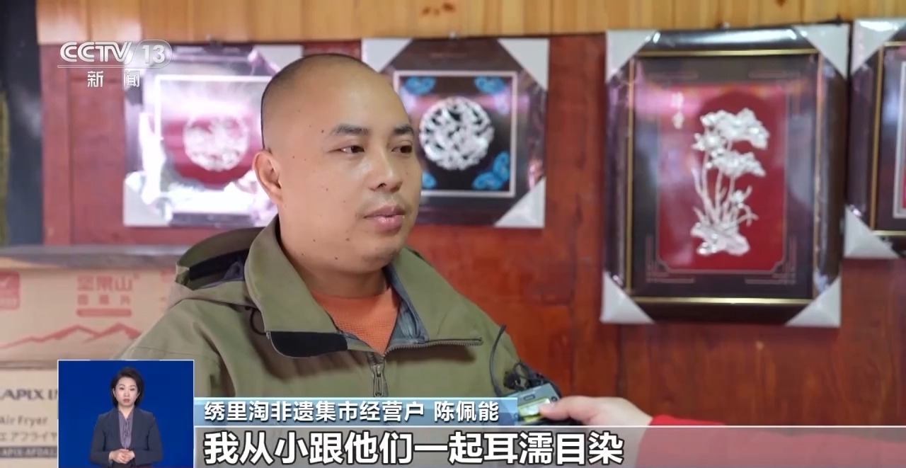 秀丽涛非遗市场经营者廖朝志:我们家主要卖蜡染。顾客喜欢它。有时他们会介绍他们向我们下订单,但有时我们无法满足他们的订单。
